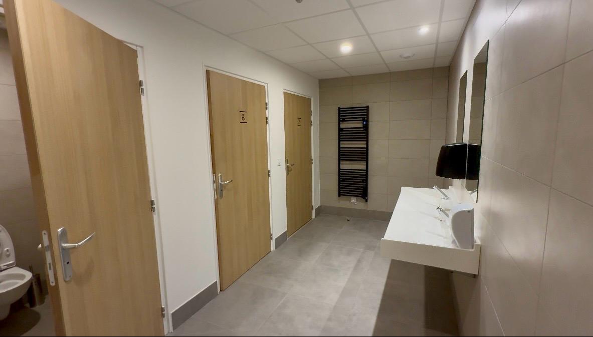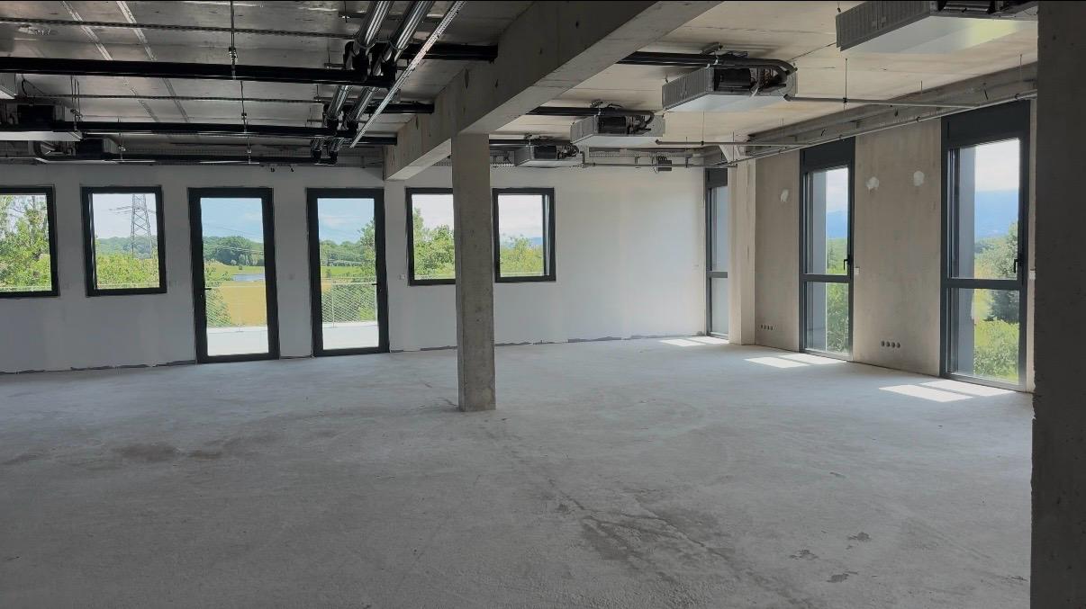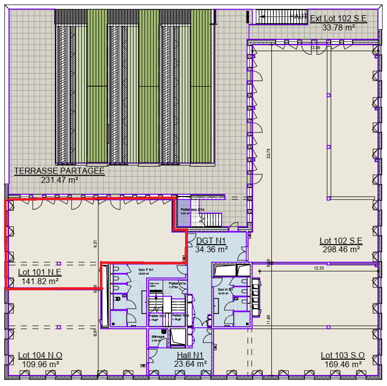 Au premier étage, un plateau de bureaux de 141,84 m² de surface privative (avec sanitaires en parties communes), livré avec à charge du client : finition de sol, cloisonnement, distribution électrique et terminaux CVC. Accès à la terrasse partagée de 226 m².