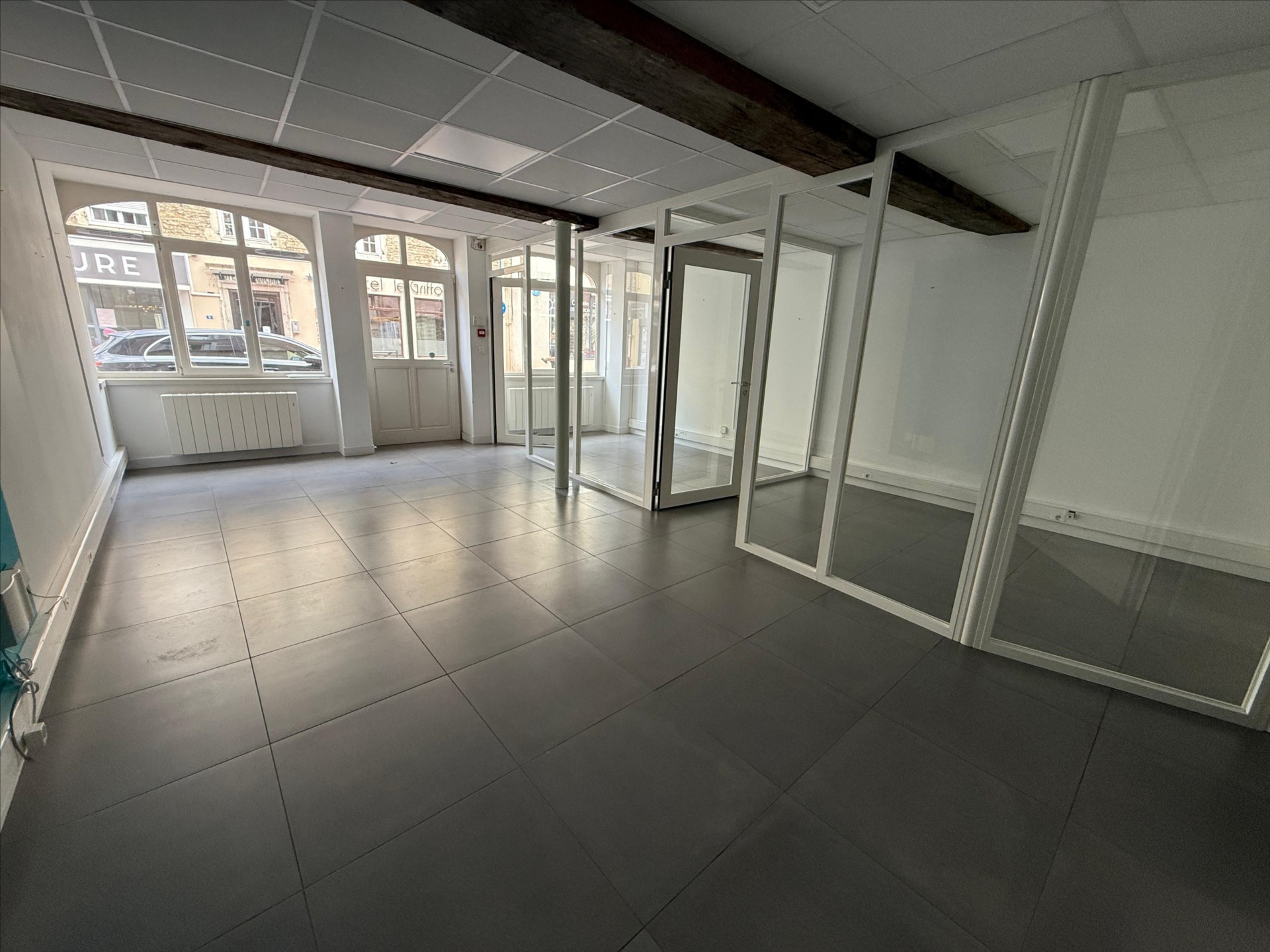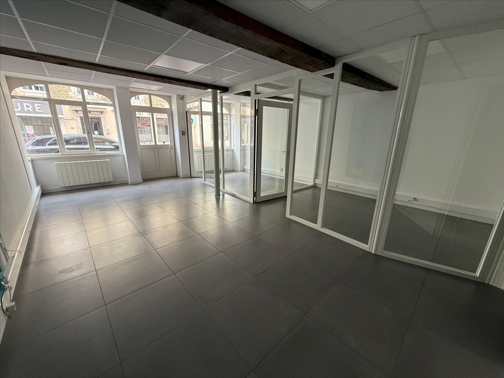 Locaux rénovés : plafond coupe-feu, faux-plafond, dalles LED, cloisonnement amovible.